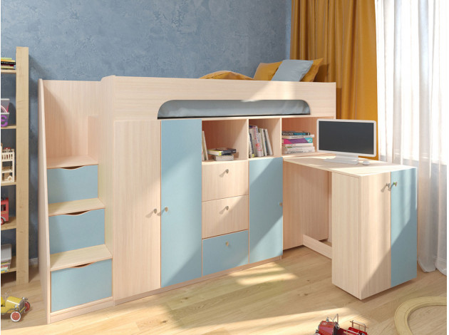 Кровать-чердак Астра 11 удачно дополнит интерьер любой детской комнаты. Продуманная система хранения позволит ребенку разложить свои вещи по местам, а выкатной столик создаст рабочую зону для занятий и учебы.