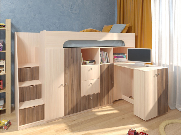 Огромные шкафы, полки, ящики, удобные ступеньки. Рабочая зона на колёсиках и независима от кровати, можно укатить куда хочешь. Ребёнок доволен.