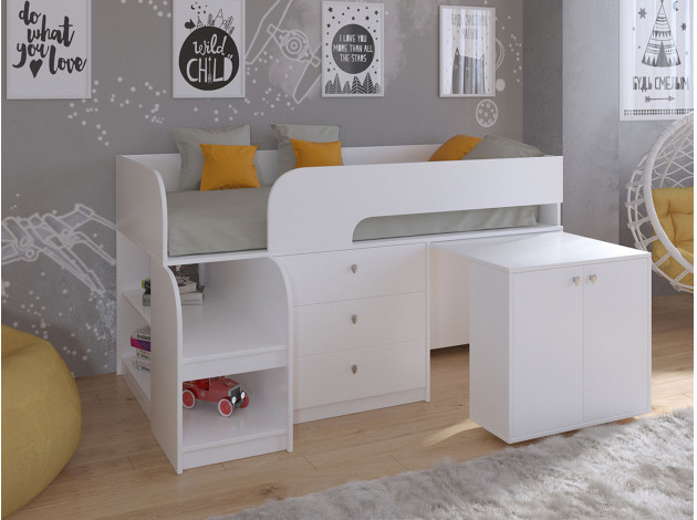 Невысокая детская кровать-чердак Астра 9/7 — это продуманная система хранения, которая позволит ребенку самостоятельно научиться размещать вещи и игрушки по местам. Выдвижной столик-тумба обеспечит удобное рабочее место для игр, учебы или творчества.