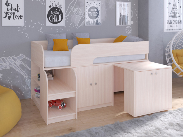 Невысокая детская кровать-чердак Астра 9/8 — это продуманная система хранения, которая позволит ребенку самостоятельно научиться размещать вещи и игрушки по местам. Выдвижной столик-тумба обеспечит удобное рабочее место для игр, учебы или творчества.