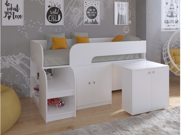Невысокая детская кровать-чердак Астра 9/8 — это продуманная система хранения, которая позволит ребенку самостоятельно научиться размещать вещи и игрушки по местам. Выдвижной столик-тумба обеспечит удобное рабочее место для игр, учебы или творчества.