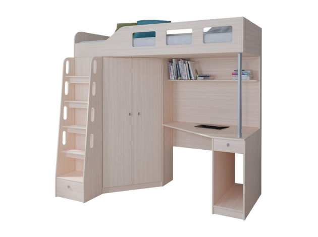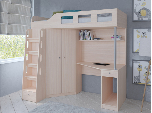 Самый оптимальный вариант кровати чердака - компактная, красивая и удобная) шкаф вместительный, есть полки, штанга. Стол большой и вместе с тем компактный, уроки удобно за ним будет делать. Два ящика, полка над столом. Купили для сына 6 лет, для детей помладше наверно будет неудобным в плане залегания и слезания - ступени металлические штанги, скользкие, есть выступ в конце лестницы, через него маленьким сложно будет перелазить. Отдельно про сам магазин - порадовала быстрая доставка в Самару, быстрое реагирование на вопросы в вайбер чате, вежливость и профессионализм. Кровать пришла в целости, собрали сами, инструкция конечно не для дилетантов, но собрать самим реально, если есть опыт