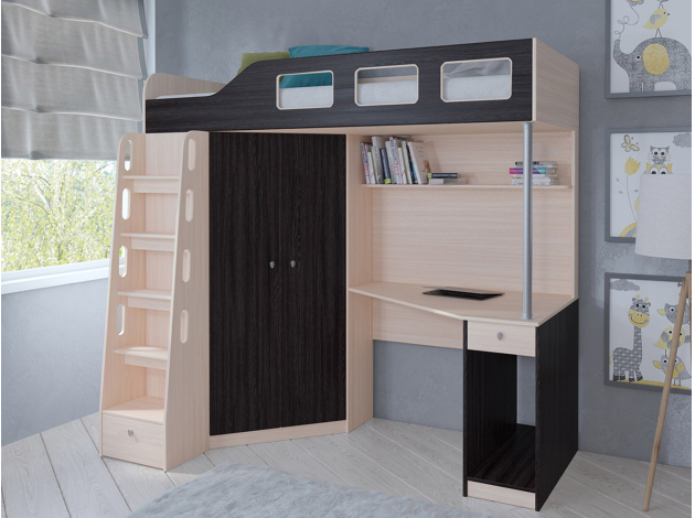 Самый оптимальный вариант кровати чердака - компактная, красивая и удобная) шкаф вместительный, есть полки, штанга. Стол большой и вместе с тем компактный, уроки удобно за ним будет делать. Два ящика, полка над столом. Купили для сына 6 лет, для детей помладше наверно будет неудобным в плане залегания и слезания - ступени металлические штанги, скользкие, есть выступ в конце лестницы, через него маленьким сложно будет перелазить. Отдельно про сам магазин - порадовала быстрая доставка в Самару, быстрое реагирование на вопросы в вайбер чате, вежливость и профессионализм. Кровать пришла в целости, собрали сами, инструкция конечно не для дилетантов, но собрать самим реально, если есть опыт