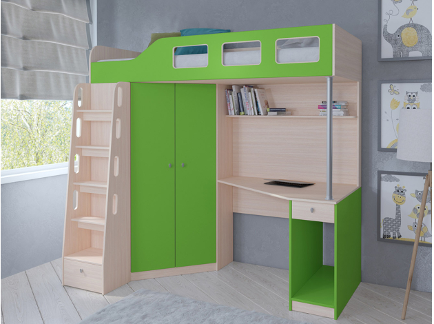 Кровать-чердак Астра-7 поможет оформить стильное и практичное пространство в детской. Разнообразие цветовых решений позволит подобрать комплекс под любой интерьер. Широкая лестница позволит легко взобраться на второй этаж, а в небольшом ящике в основании лесенки будет удобно хранить различные мелочи.