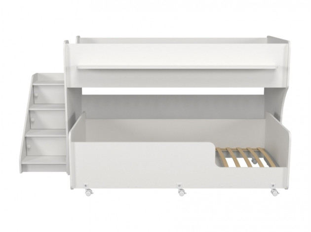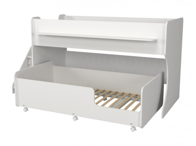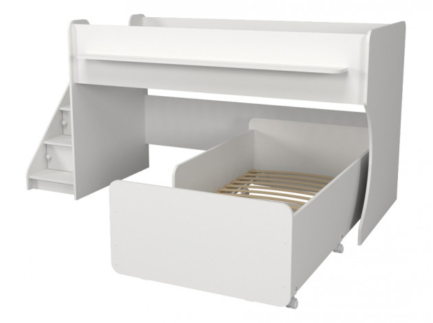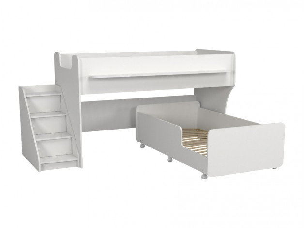 Кровать-чердак Минки — функциональная модель, которая трансформируется в несколько разных мебельных изделий: двухъярусную кровать, кровать-чердак со спальным местом наверху и игровой или рабочей зоной внизу. В комплект входит удобная лестница с широкими ступенями и ящиками.