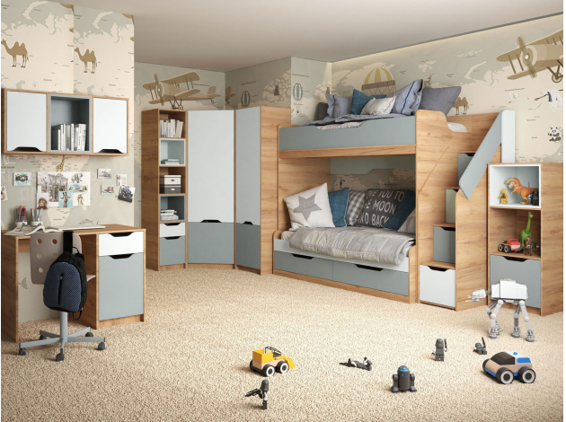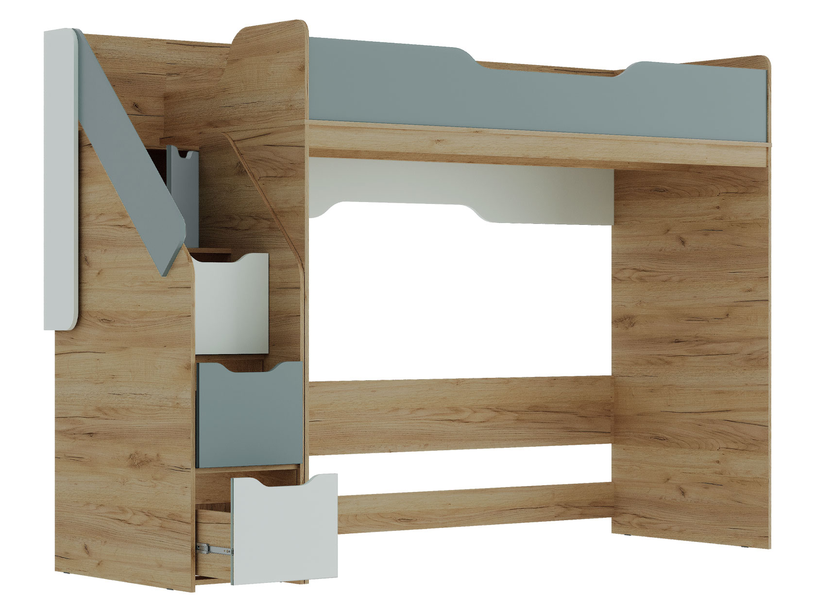 Кровать-чердак Рич продумана в каждой детали. Гармоничное сочетание оттенков и плавные линии без острых углов делают модель комфортным и безопасным дополнением интерьера. Под тремя ступеньками лестницы предусмотрен вместительный выдвижной ящик. Такое решение экономит свободное пространство комнаты и создает удобные ниши для хранения.