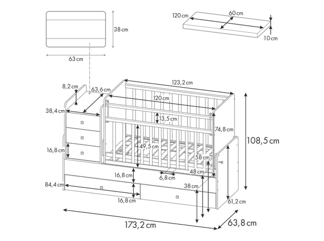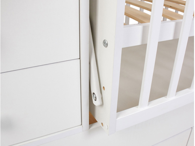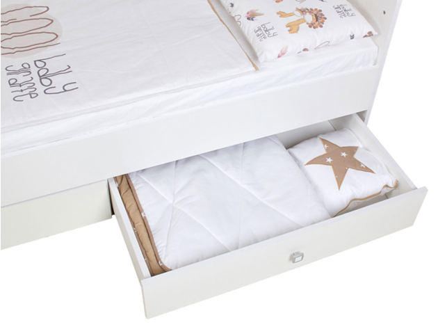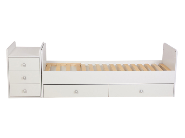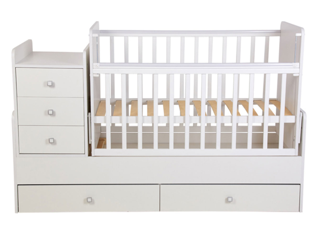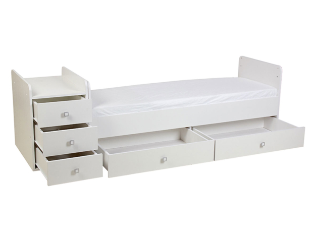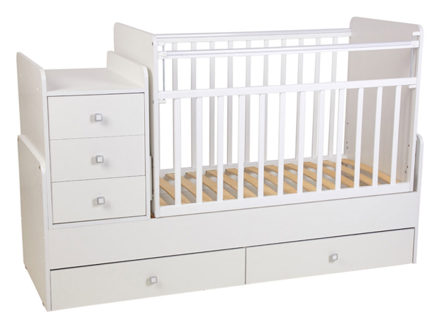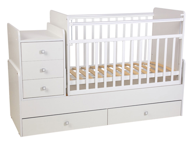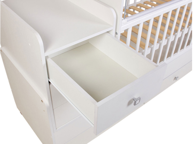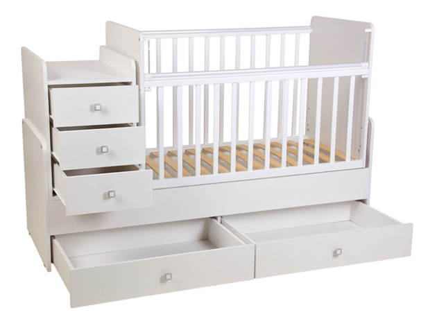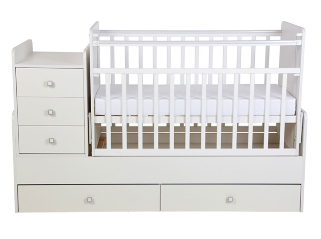 Кроватка-трансформер для новорожденных Флор продумана в каждой детали. Спальное место дополнено комодом с поверхностью для пеленания и выдвижными ящиками в основании. Закругленные бортики и силиконовые накладки заботятся о безопасности малыша, а маятниковый механизм помогает ему быстрее засыпать. Когда ребенок вырастет, модель можно трансформировать в подростковую кровать и отдельную приставную тумбу.