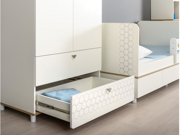 Детский шкаф Эйп станет функциональным элементом комнаты с интерьером в скандинавском стиле. Внутреннее наполнение включает всё необходимое для упорядоченного хранения гардероба: отделение со штангой для вешалок, ряд полок для сложенной одежды и два вместительных ящика, которые выдвигаются на всю глубину. Благодаря регулируемым опорам модель можно установить даже на неровном полу.