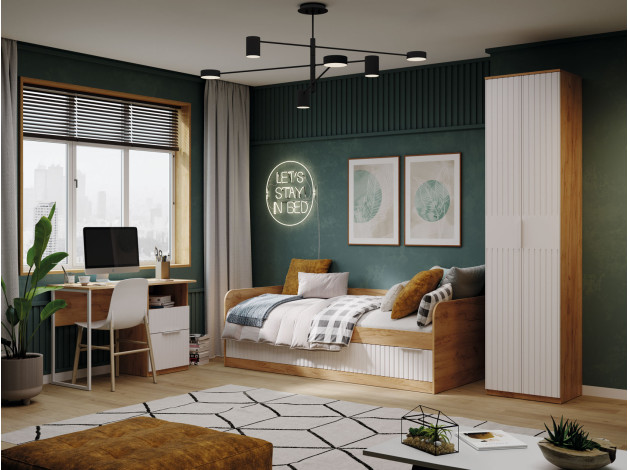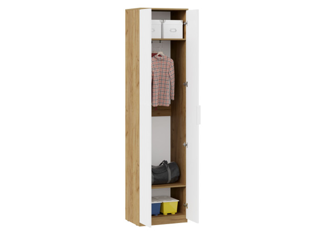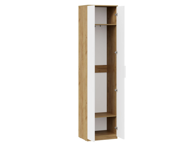 Распашной шкаф Хилтон оснащен штангой для вешалок и парой полок для хранения сложенных вещей. Сочетание разных оттенков, а также фрезеровка на фасадах придает модели по-настоящему привлекательный и небанальный вид. Шкаф достаточно компактный, поэтому поместится даже в небольшой комнате.