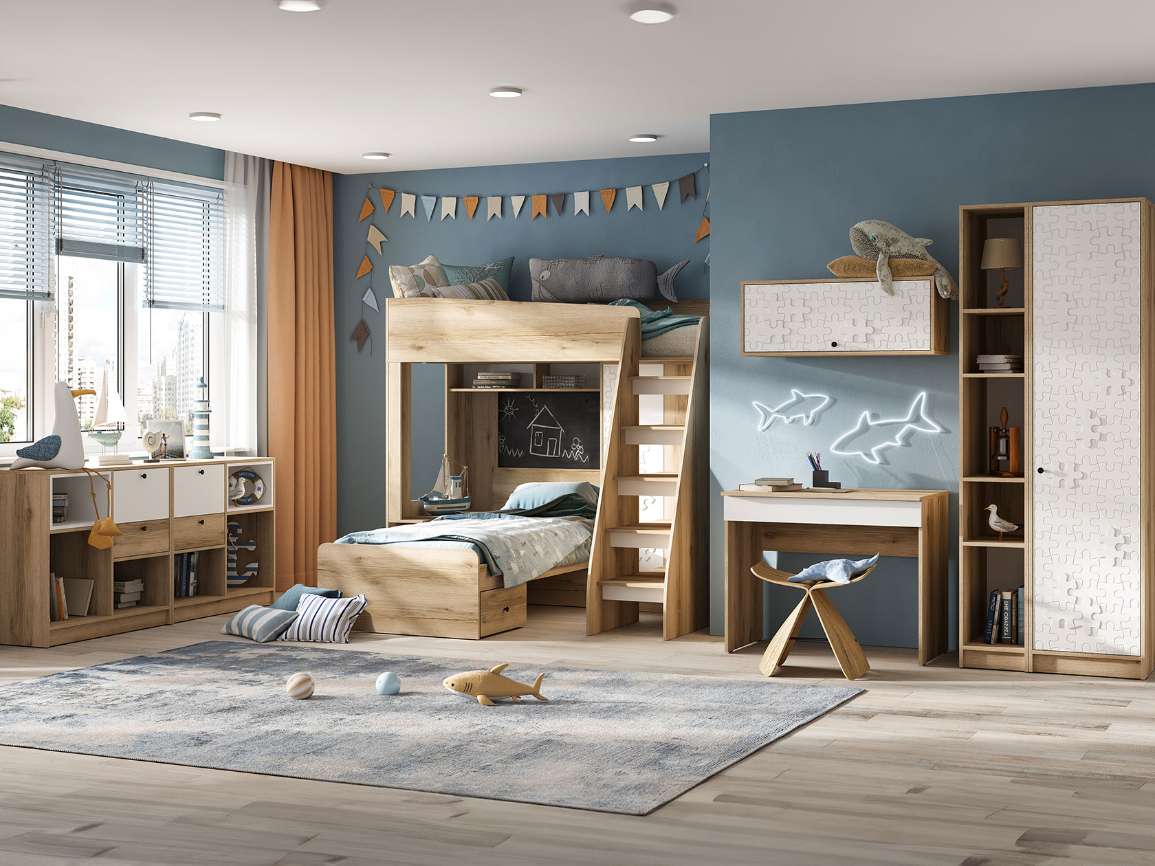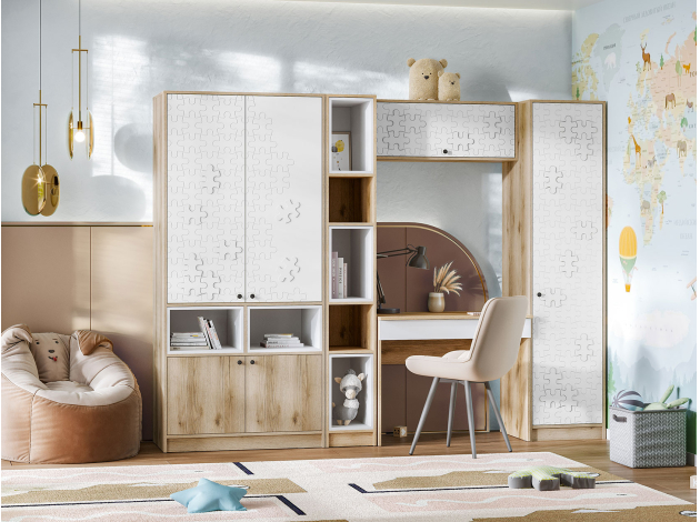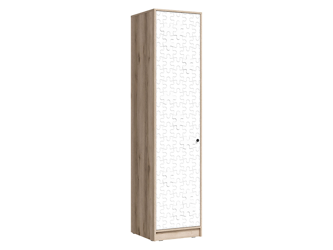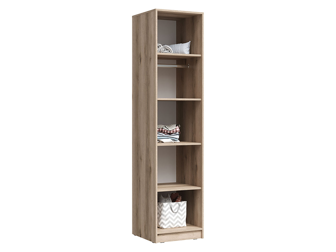 Детский шкаф Киви — практичное решение для небольшой комнаты. Узкая конструкция позволяет интегрировать модель даже в ограниченное пространство. Полки систематизируют хранение разных категорий вещей. При необходимости часть полок можно убрать, заменив на штангу.