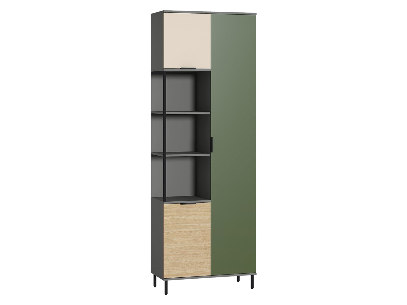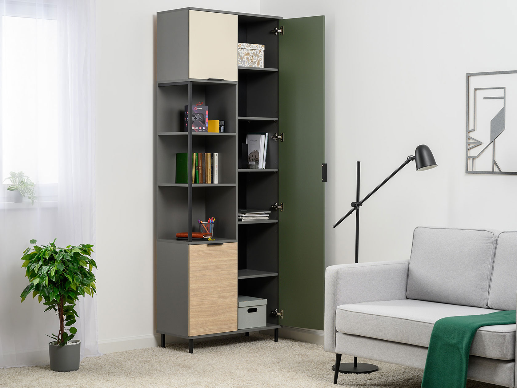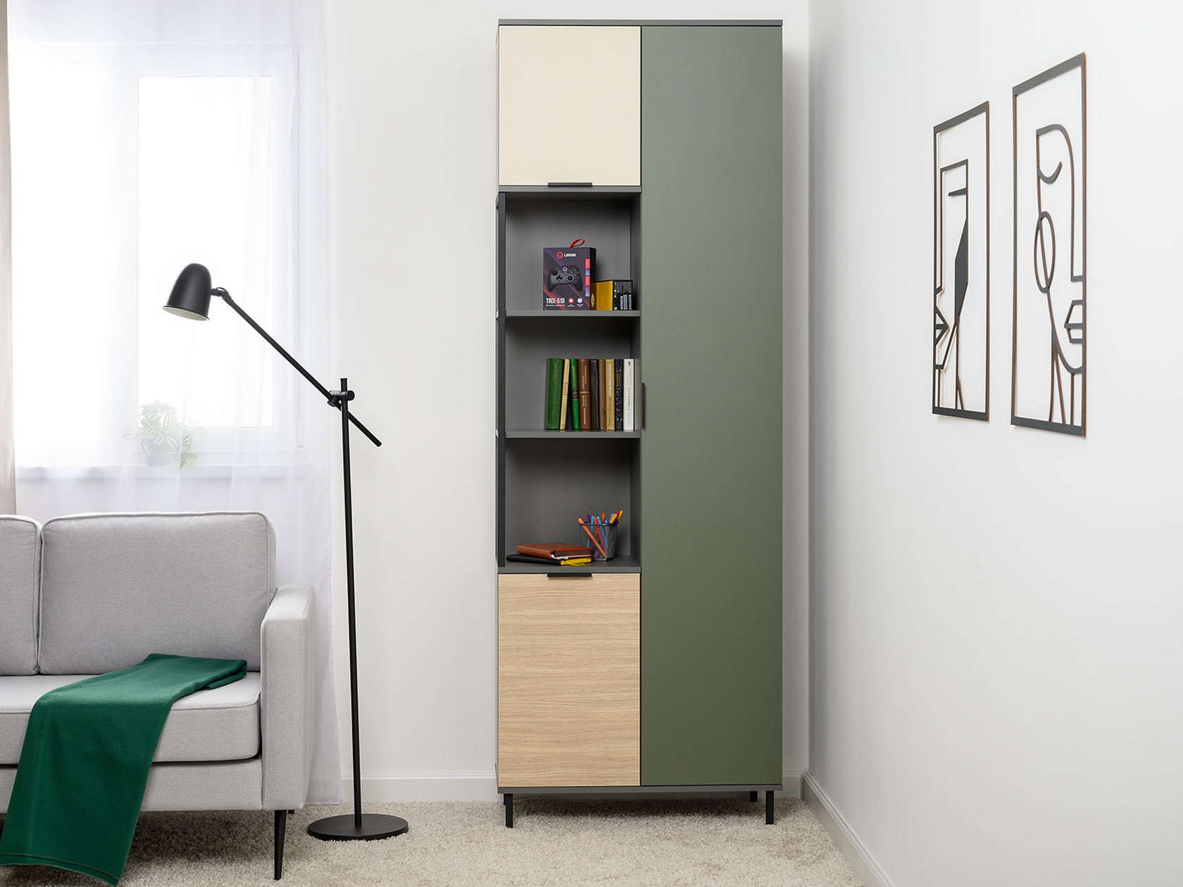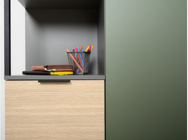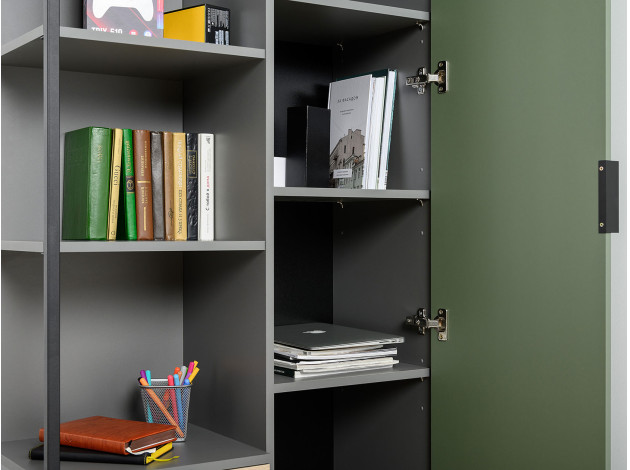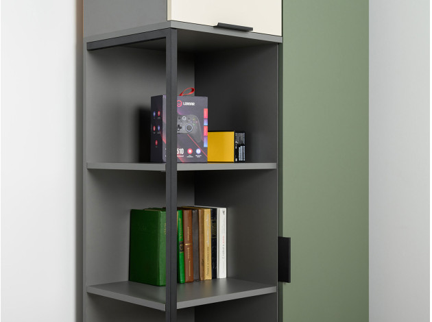 Детский шкаф Марвэл комбинированный решит вопросы хранения одежды и других важных вещей. Сочетание открытого стеллажа и закрытой секции с полками обеспечит место для книг, учебников, папок с документами и предметов гардероба. Фасады разных оттенков создают яркий, живой интерьер, а минималистичная фурнитура не отвлекает от самой мебели.