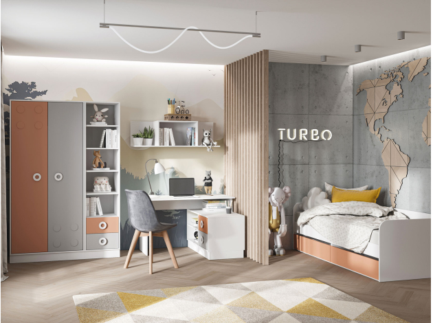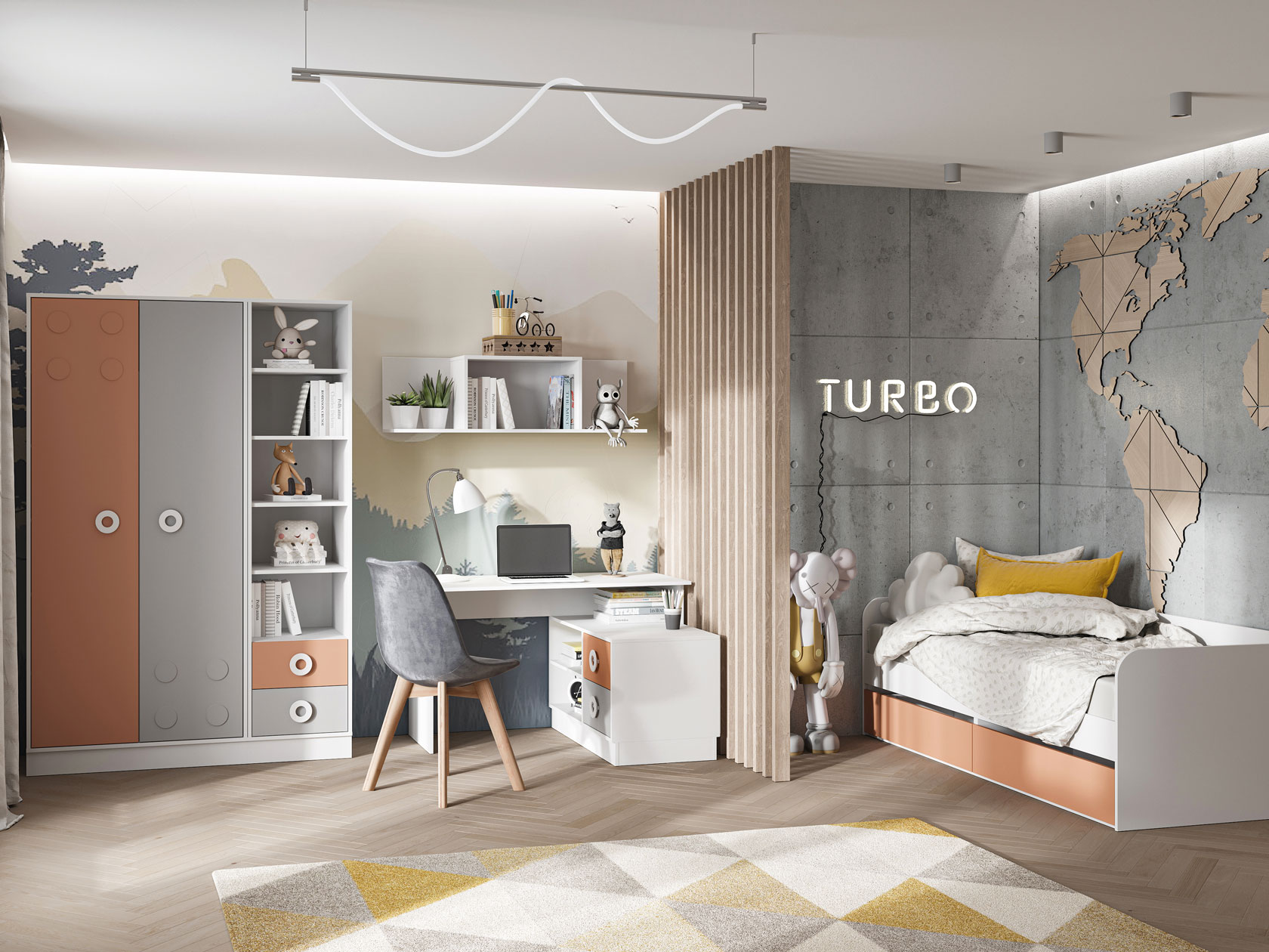 Детский шкаф Турбо создаст организованную систему хранения всех вещей: от школьной формы до спортивной экипировки. Внутреннее пространство поделено на два равных отделения: со штангой для вешалок и полками для сложенной одежды. Дизайн с объемными элементами и выпуклыми ручками-кнопками создает привлекательные акценты комнаты.
