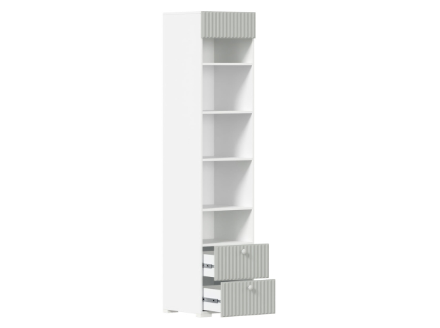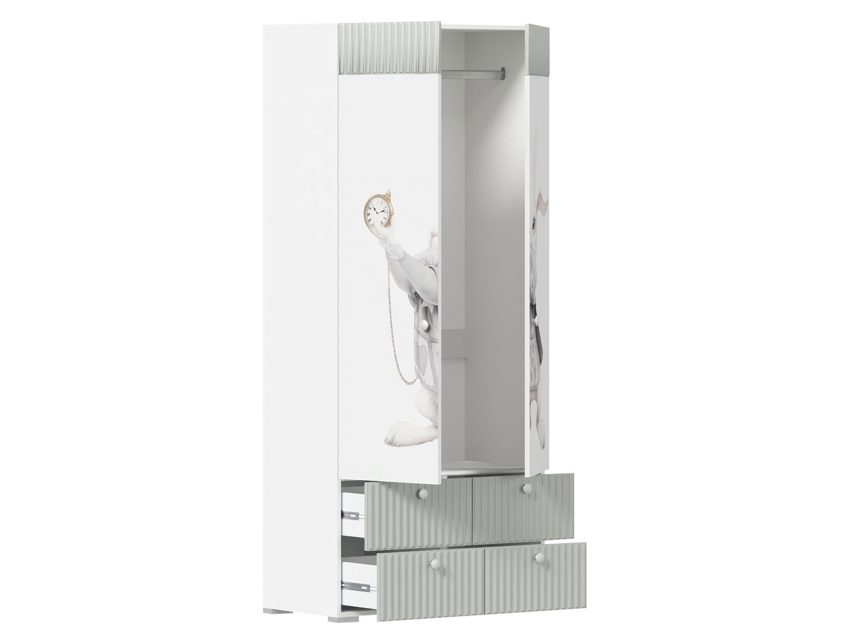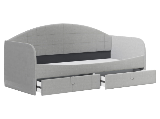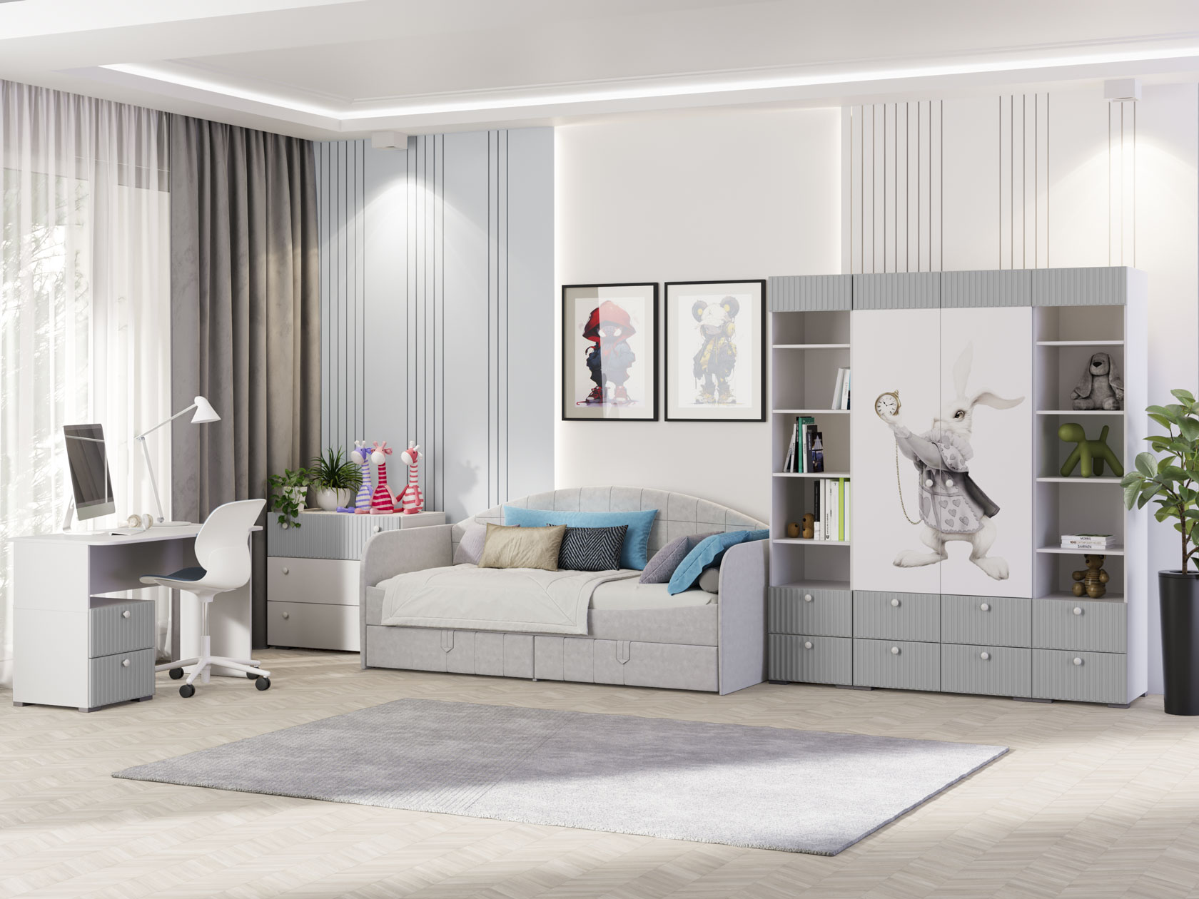 Комплект детской мебели Алиса Грей — универсальный набор элементов для функционального интерьера комнаты ребенка любого возраста. Мягкая кровать с выдвижными ящиками станет излюбленным островком для отдыха. Удобный распашной шкаф обеспечит место для одежды. Полки и выдвижные ящики помогут поддерживать порядок в игрушках, книгах и прочих мелочах. Контрастный принт и рифленая фрезеровка выступают привлекательными акцентами пространства.