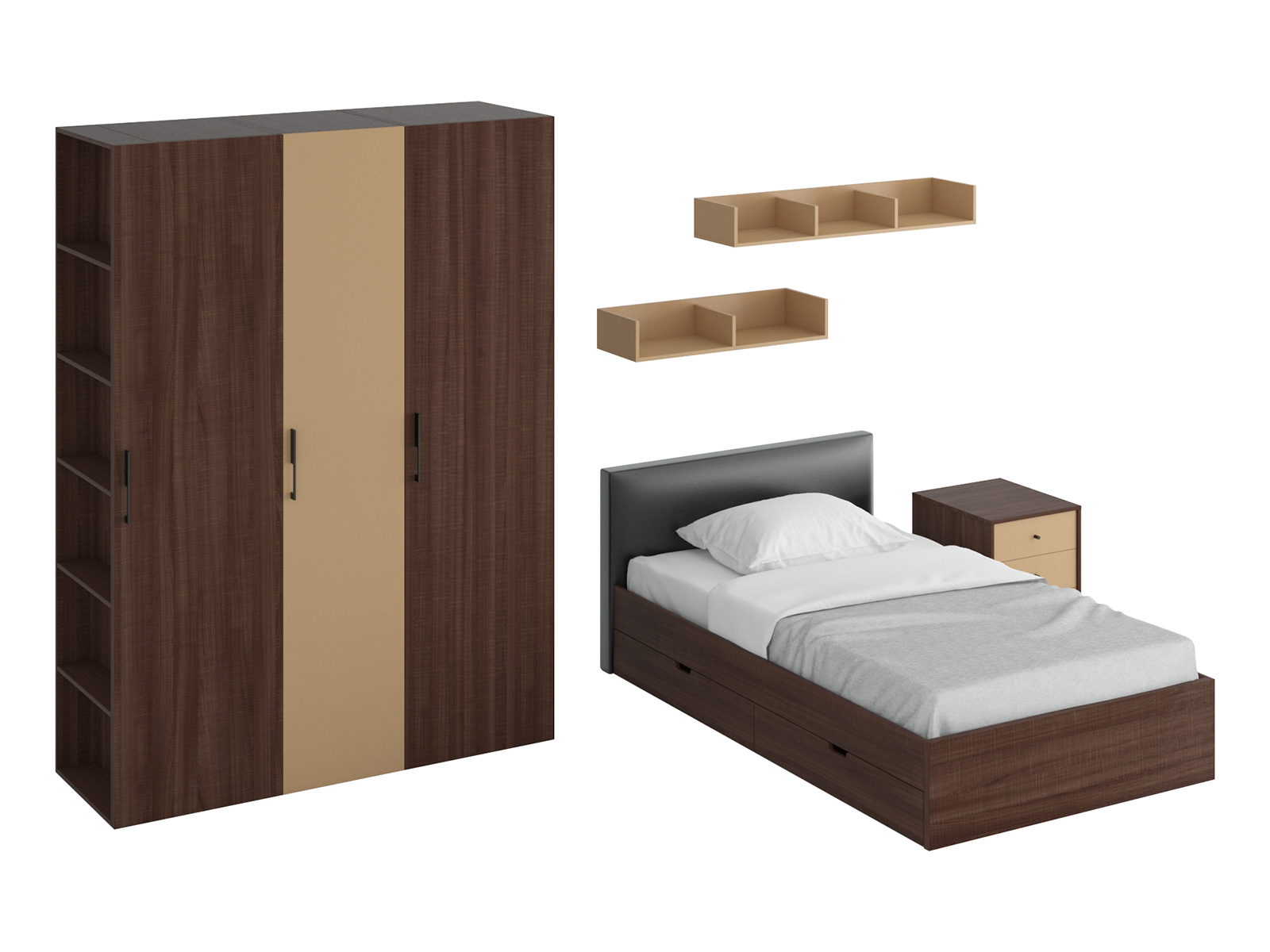 Комплект мебели для молодежной комнаты в современном стиле. Каждый модуль из комплекта удобный и функциональный. При помощи этой композиции вы организуете комфортную зону отдыха и зону хранения.