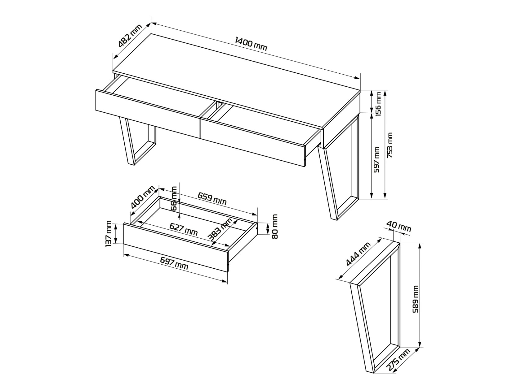 - Письменный стол: 75,3 х 140 х 48,2 см.
