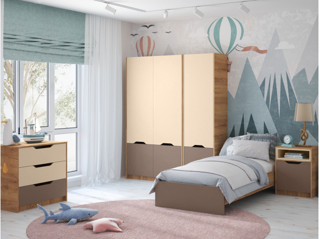 Комплект детской мебели Рич создаст комфортную обстановку, в которой приятно проводить свободное время. Зона отдыха включает удобную кровать и небольшую тумбочку, а для одежды и игрушек есть вместительная шкафная группа и комод с ящиками. Фасады выполнены в приятных оттенках и дополнены эргономичными прорезями вместо ручек.