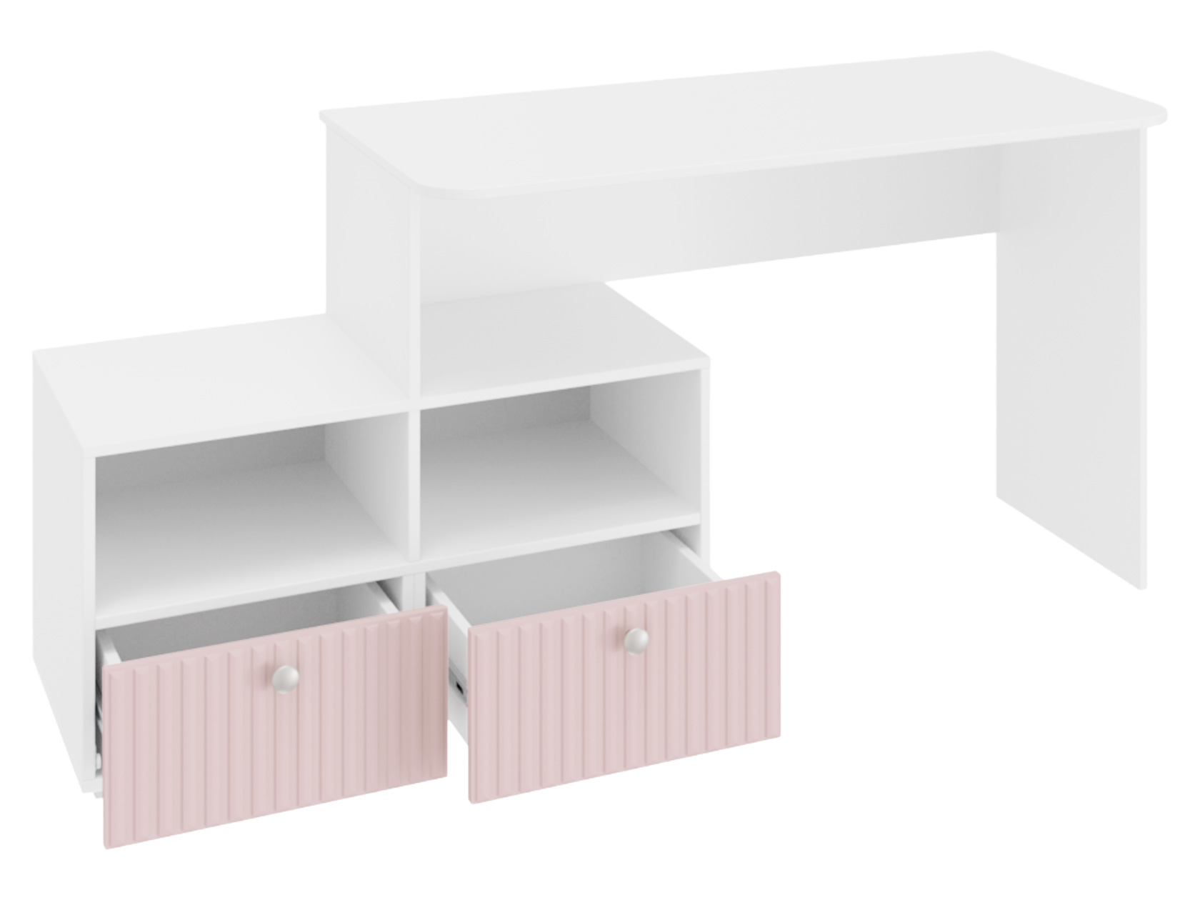 Детский письменный стол Алиса оснащен широкой столешницей и вместительной тумбой с ящиками и полками. Модель поможет оформить удобный уголок для учебы и занятий творчеством. Цветовая гамма и оформление фасадов придутся по вкусу любой девочке.