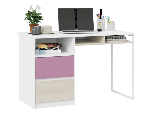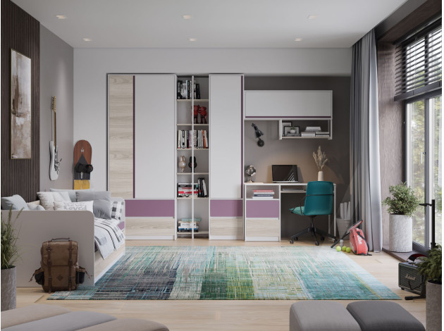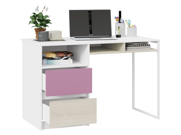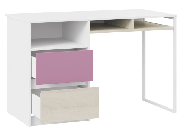 Письменный стол Сканди станет основой уголка для учебы и занятий творчеством. На просторной столешнице найдется место для ноутбука, органайзеров, лампы и учебника с тетрадью. Остальные принадлежности удобно хранить в выдвижных ящиках и на открытых полках. Фасады без выступающих элементов открываются за скошенный край торца, что делает модель более комфортной и безопасной.