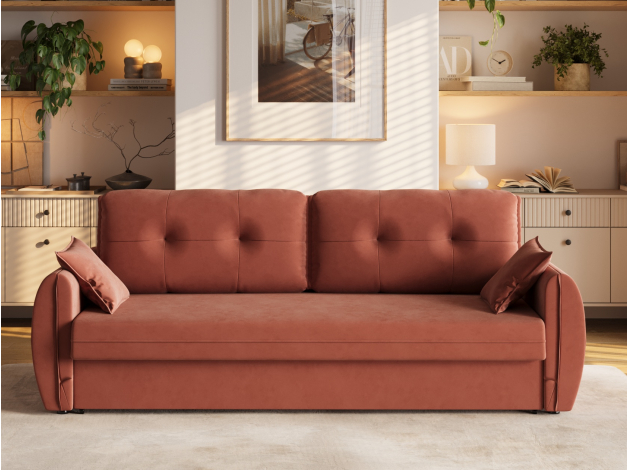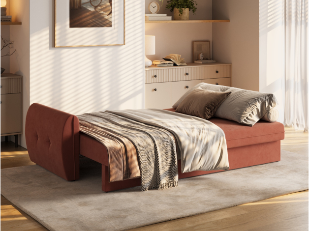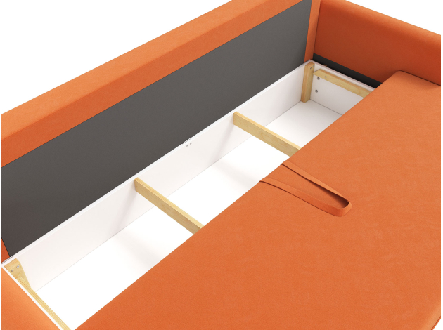 На время сна диван легко превращается в ровную кровать. Раскладной механизм прост в эксплуатации и подходит для ежедневного использования. Для постельных принадлежностей или сезонных вещей есть вместительный короб.