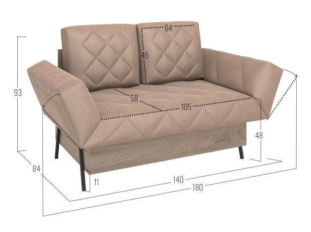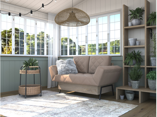 Прямой диван Джойс — настоящая находка для небольшой квартиры, кухни или дачи. Мягкие подушки с декоративной стежкой обеспечивают комфорт во время отдыха. Подлокотники регулируются: их можно установить под углом, сэкономив пространство, а также разложить, увеличив количество посадочных мест или превратив диван в ровную зону для сна. Короб в основании подходит для хранения постельных принадлежностей, а высокие ножки упрощают уборку.