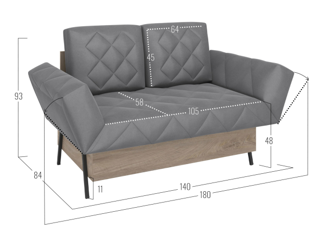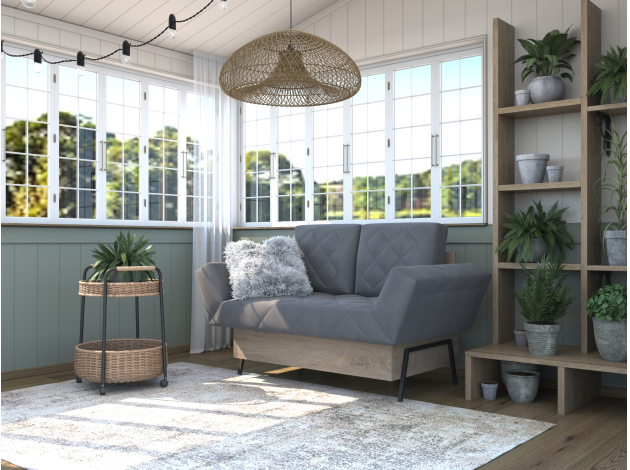 Прямой диван Джойс — настоящая находка для небольшой квартиры, кухни или дачи. Мягкие подушки с декоративной стежкой обеспечивают комфорт во время отдыха. Подлокотники регулируются: их можно установить под углом, сэкономив пространство, а также разложить, увеличив количество посадочных мест или превратив диван в ровную зону для сна. Короб в основании подходит для хранения постельных принадлежностей, а высокие ножки упрощают уборку.