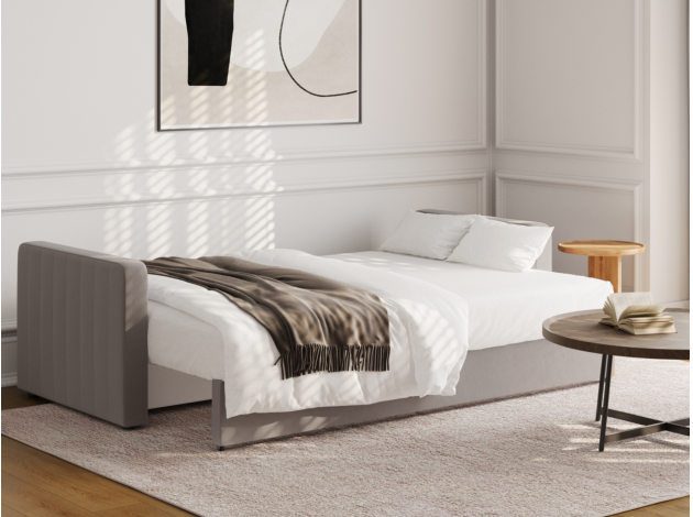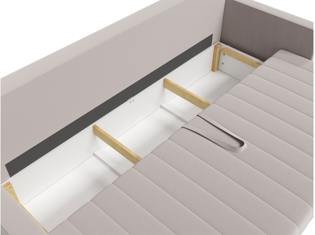 С помощью надежного механизма модель легко трансформировать в ровное спальное место. Конструкция проста в эксплуатации и рассчитана на частое использование. Практичный бельевой короб предназначен для аккуратного хранения одеял, пледов и других постельных принадлежностей.
