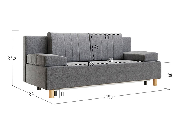 - Посадочное место без подушек (ШхГ): 199 х 72 см.