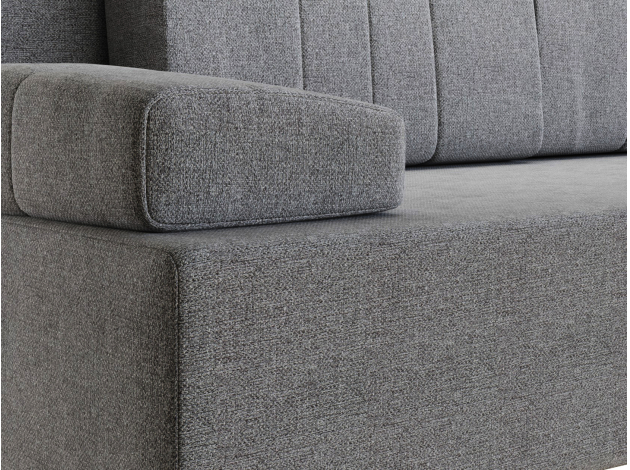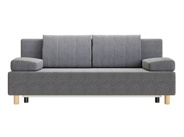 Прямой диван Тиас привлекает внимание лаконичной формой и отсутствием подлокотников, в роли которых выступают низкие валики. Удобное посадочное место и мягкие подушки создают все условия для комфортного отдыха. Спинка обита лицевой тканью, поэтому модель можно установить как вдоль стены, так и в любой точке комнаты. С помощью простого и надежного механизма трансформации диван легко превращается в просторную спальную зону. Для постельных принадлежностей предусмотрен бельевой короб. Небольшие ножки придают мебели визуальную легкость.