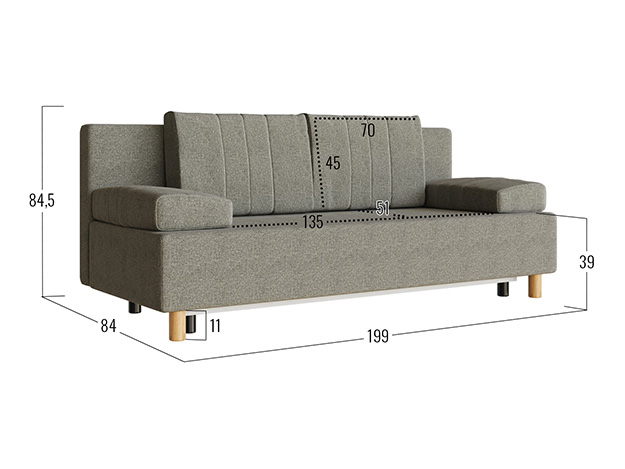 - Посадочное место без подушек (ШхГ): 199 х 72 см.