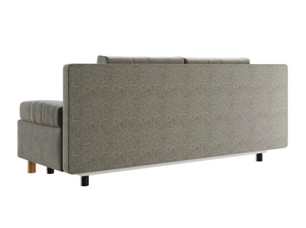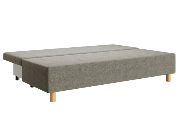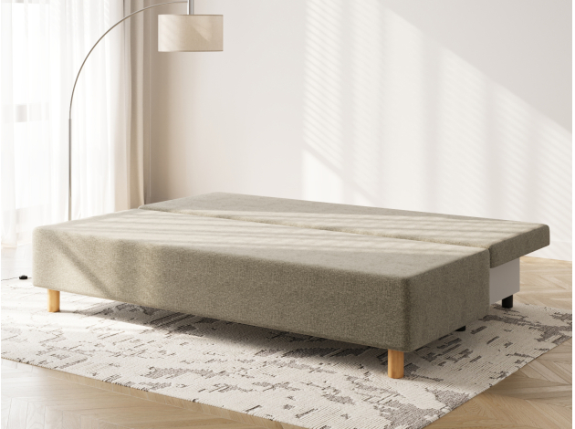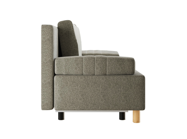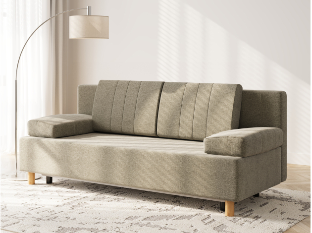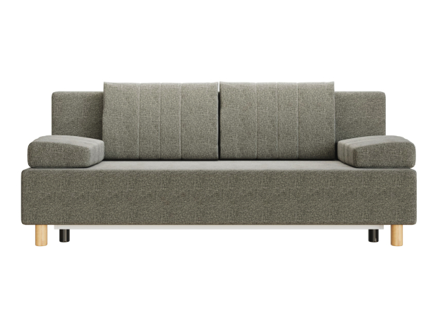 Прямой диван Тиас привлекает внимание лаконичной формой и отсутствием подлокотников, в роли которых выступают низкие валики. Удобное посадочное место и мягкие подушки создают все условия для комфортного отдыха. Спинка обита лицевой тканью, поэтому модель можно установить как вдоль стены, так и в любой точке комнаты. С помощью простого и надежного механизма трансформации диван легко превращается в просторную спальную зону. Для постельных принадлежностей предусмотрен бельевой короб. Небольшие ножки придают мебели визуальную легкость.