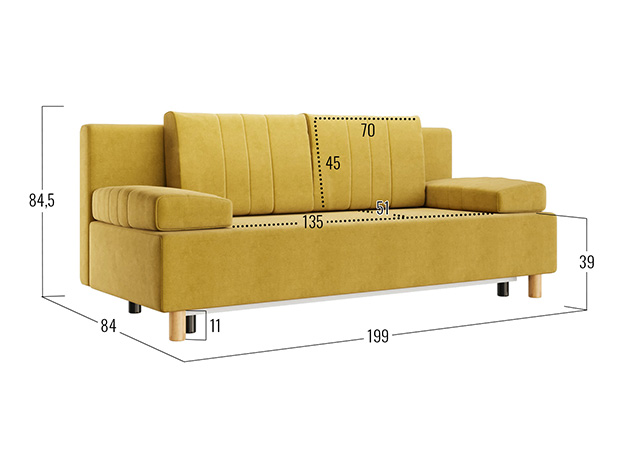- Посадочное место без подушек (ШхГ): 199 х 72 см.