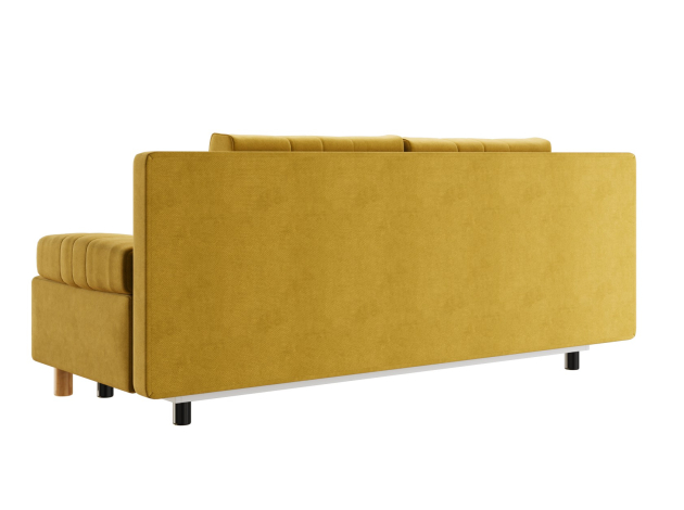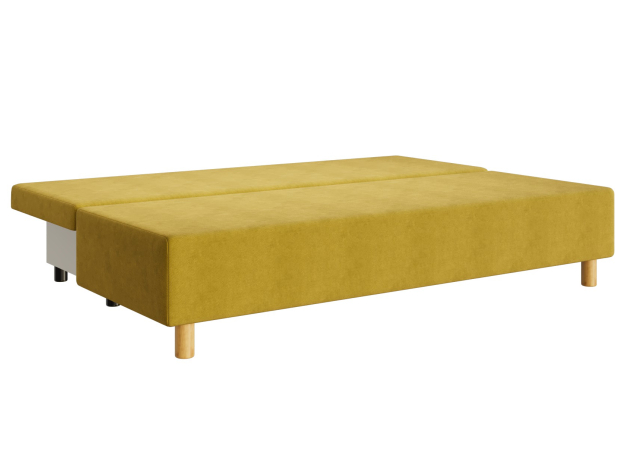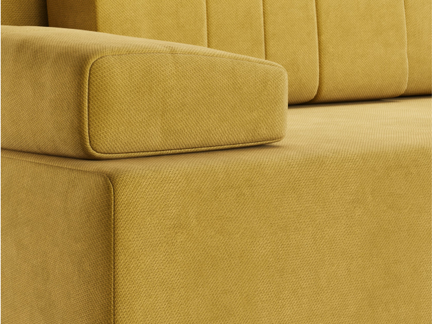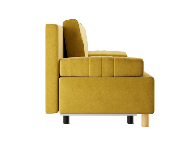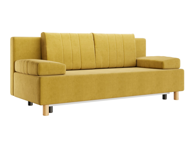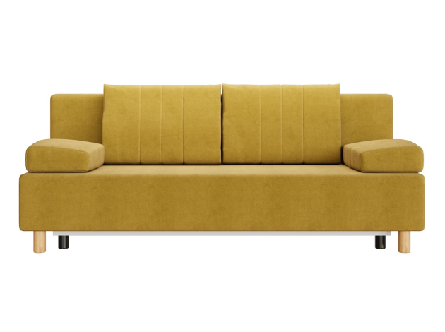 Прямой диван Тиас привлекает внимание лаконичной формой и отсутствием подлокотников, в роли которых выступают низкие валики. Удобное посадочное место и мягкие подушки создают все условия для комфортного отдыха. Спинка обита лицевой тканью, поэтому модель можно установить как вдоль стены, так и в любой точке комнаты. С помощью простого и надежного механизма трансформации диван легко превращается в просторную спальную зону. Для постельных принадлежностей предусмотрен бельевой короб. Небольшие ножки придают мебели визуальную легкость.