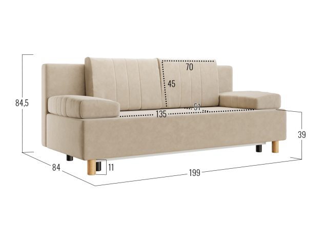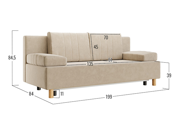 - Посадочное место без подушек (ШхГ): 199 х 72 см.