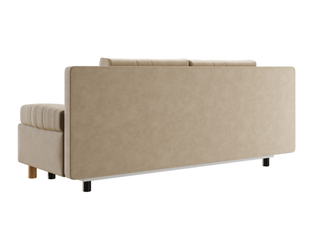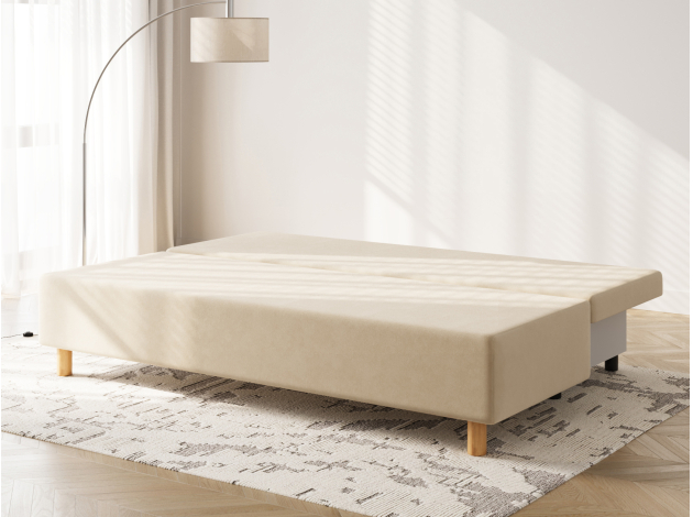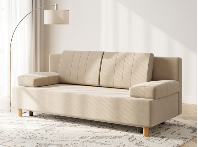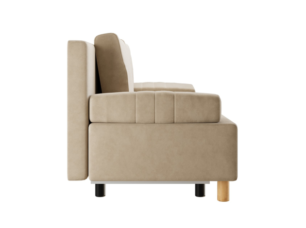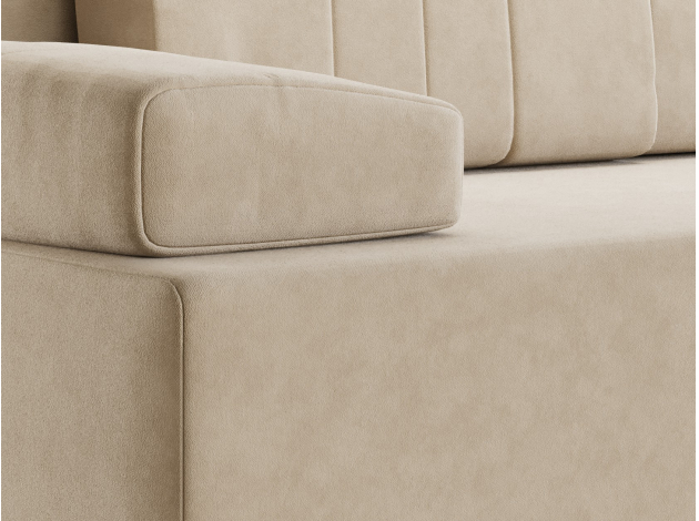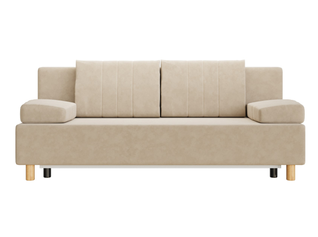 Прямой диван Тиас привлекает внимание лаконичной формой и отсутствием подлокотников, в роли которых выступают низкие валики. Удобное посадочное место и мягкие подушки создают все условия для комфортного отдыха. Спинка обита лицевой тканью, поэтому модель можно установить как вдоль стены, так и в любой точке комнаты. С помощью простого и надежного механизма трансформации диван легко превращается в просторную спальную зону. Для постельных принадлежностей предусмотрен бельевой короб. Небольшие ножки придают мебели визуальную легкость.