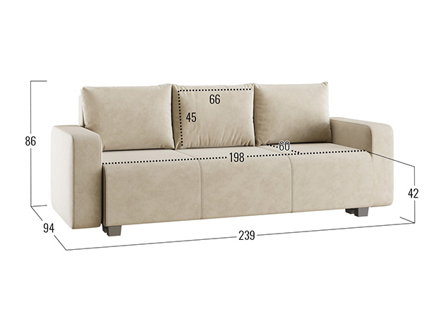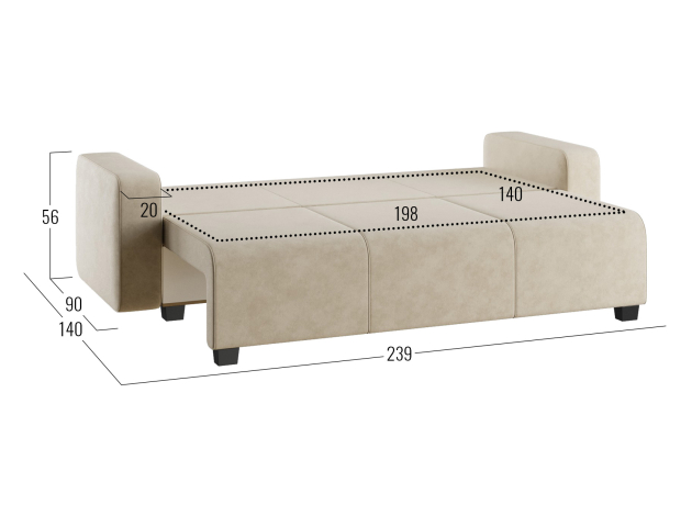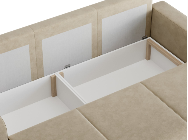 В разложенном виде образуется ровная и комфортная для сна поверхность. В основании предусмотрен просторный короб с двумя отсеками, что делает диван еще практичнее и создает дополнительные ниши для хранения вещей.