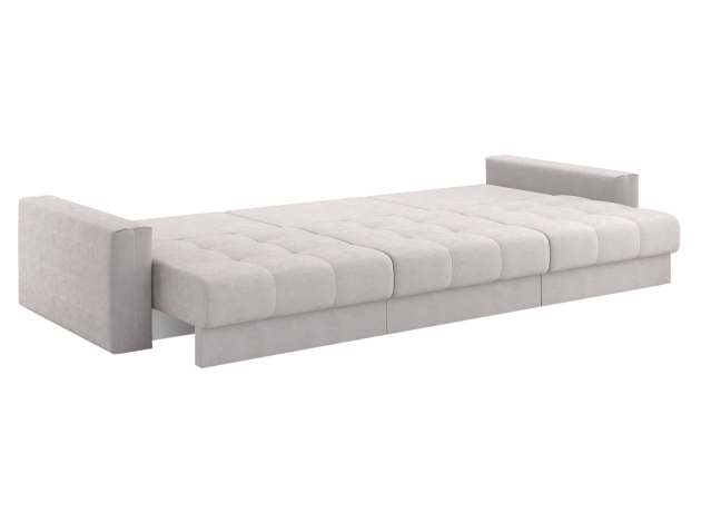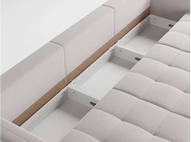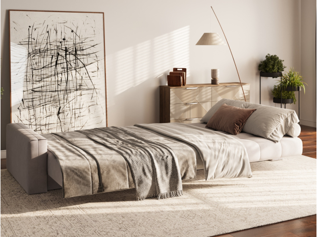Надежный механизм трансформации легко превращает диван в ровное спальное место. Благодаря продуманному наполнению его можно использовать для ежедневного сна. Модель комплектуется вместительным коробом для хранения постельных принадлежностей.