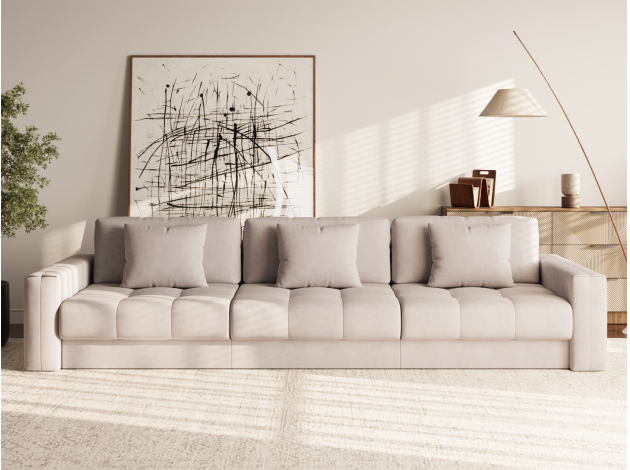 Прямой диван Клермон Макси — основательная модель для комфортабельного отдыха. В просторной гостиной диван можно использовать для зонирования пространства, установив в любой точке комнаты. Приспинные и декоративные подушки позволяют устроиться максимально удобно, независимо от роста и комплекции сидящего.