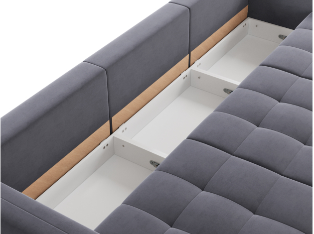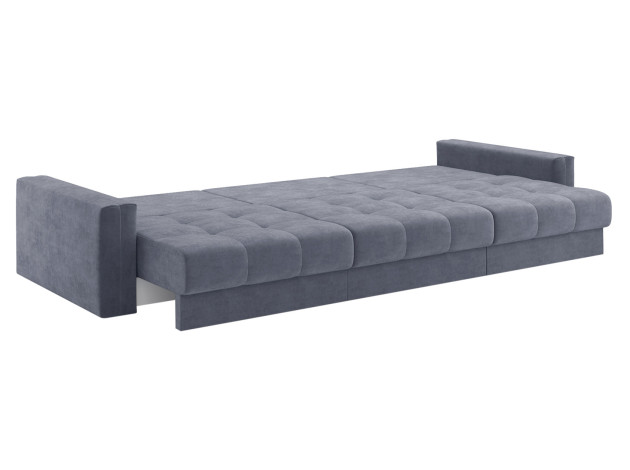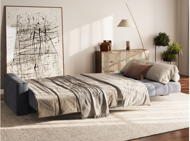 Надежный механизм трансформации легко превращает диван в ровное спальное место. Благодаря продуманному наполнению его можно использовать для ежедневного сна. Модель комплектуется вместительным коробом для хранения постельных принадлежностей.