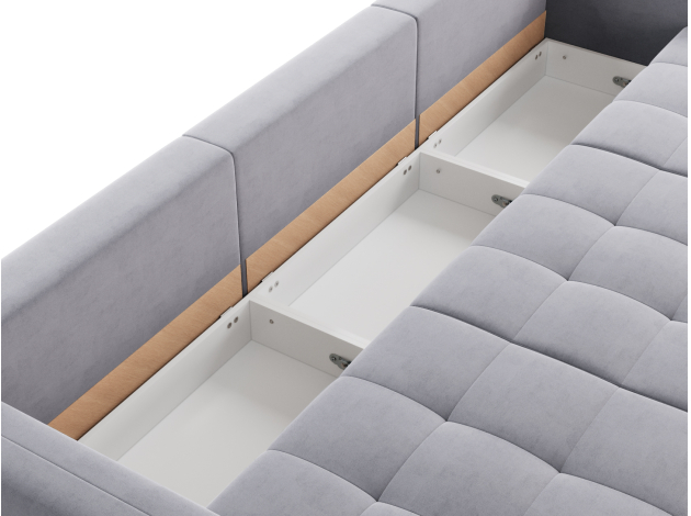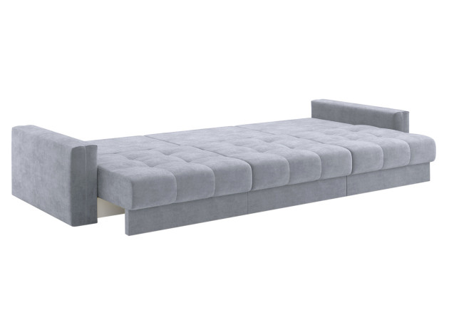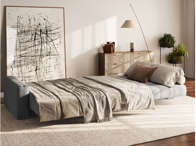 Надежный механизм трансформации легко превращает диван в ровное спальное место. Благодаря продуманному наполнению его можно использовать для ежедневного сна. Модель комплектуется вместительным коробом для хранения постельных принадлежностей.