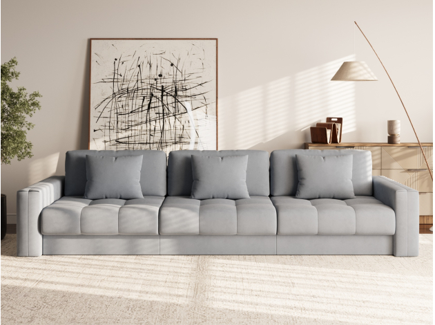 Прямой диван Клермон Макси — основательная модель для комфортабельного отдыха. В просторной гостиной диван можно использовать для зонирования пространства, установив в любой точке комнаты. Приспинные и декоративные подушки позволяют устроиться максимально удобно, независимо от роста и комплекции сидящего.