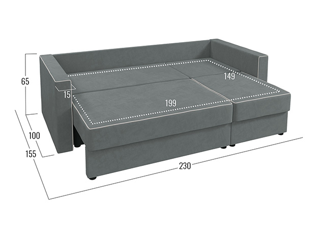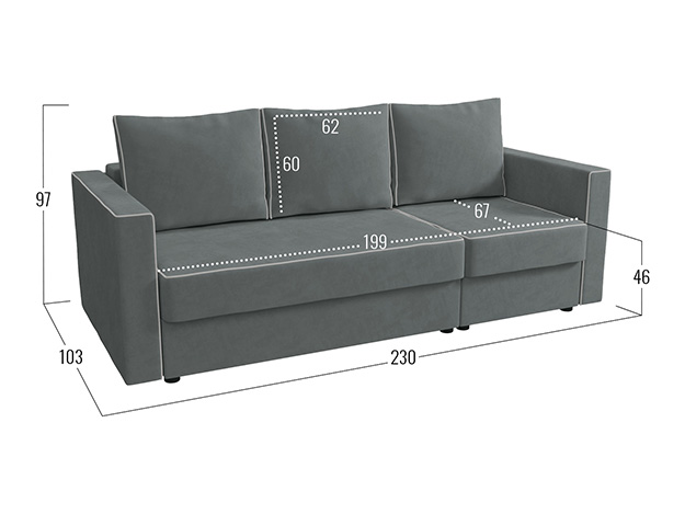 - Посадочное место без подушек (ШхГ): 199 х 82 см.