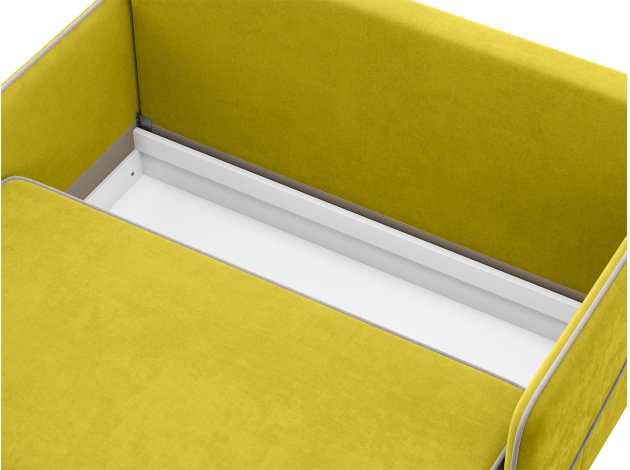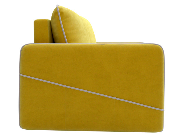 Сиденье, подлокотники и подушки украшены контрастным кантом. Такой декор подчеркивает лаконичную форму модели и выступает в роли акцента. Диван безупречно смотрится с любого ракурса, что позволяет использовать его для зонирования пространства. Ящик для белья — практичное решение для небольших помещений.