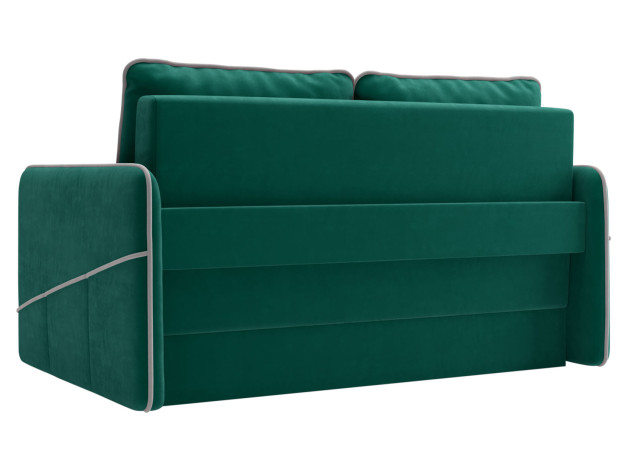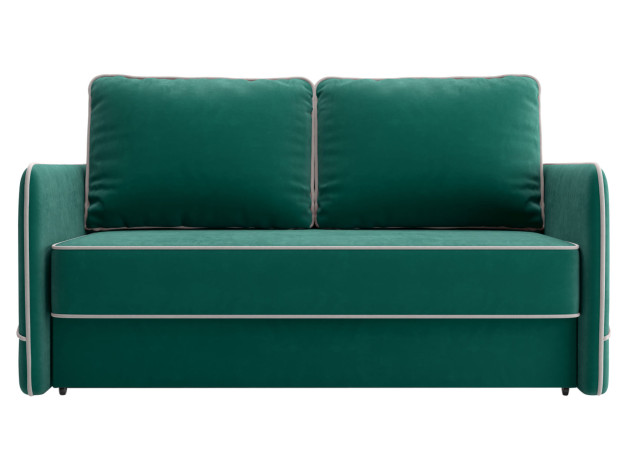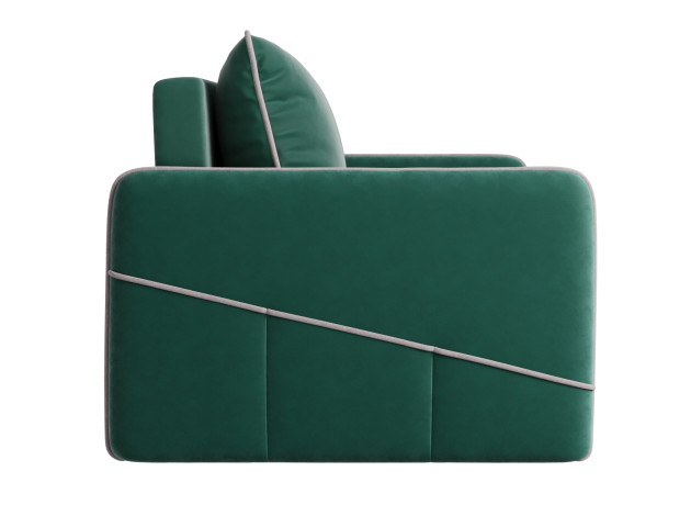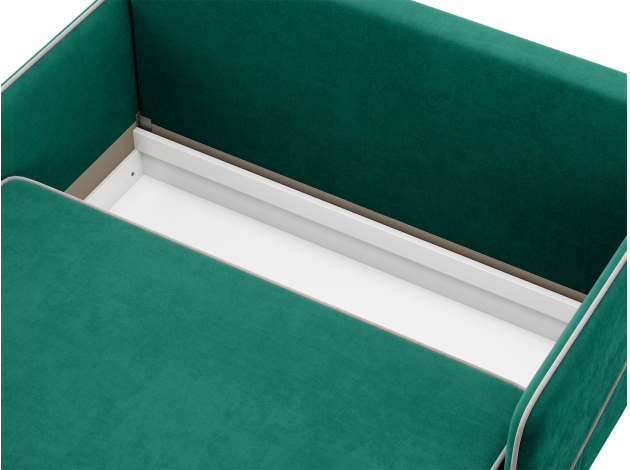 Сиденье, подлокотники и подушки украшены контрастным кантом. Такой декор подчеркивает лаконичную форму модели и выступает в роли акцента. Диван безупречно смотрится с любого ракурса, что позволяет использовать его для зонирования пространства. Ящик для белья — практичное решение для небольших помещений.