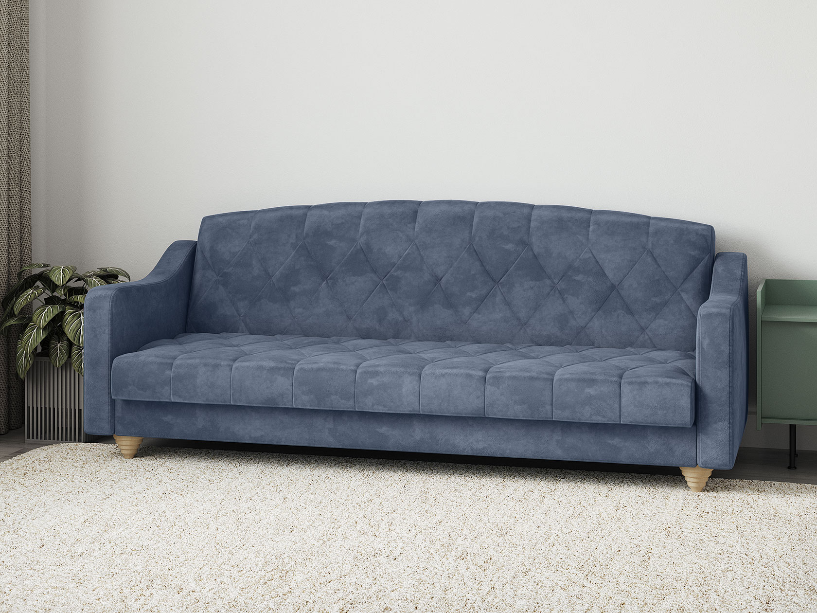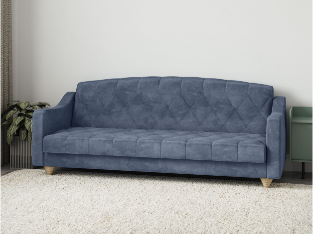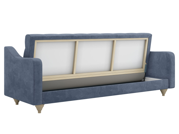 Модель легко трансформируется в ровное спальное место без стыков и перепадов высоты. Для постельных принадлежностей есть удобный бельевой короб. Приятная на ощупь обивка устойчива к износу и легко поддается чистке. Со всех сторон используется основная ткань, поэтому диван отлично смотрится с любого ракурса.