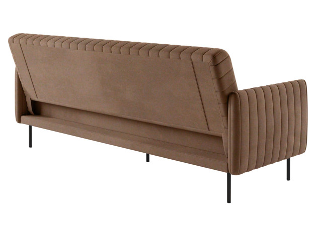 Механизм трансформации позволяет быстро зафиксировать спинку в одном из трех положений: для отдыха сидя, в положении «релакс» или горизонтально для сна. В разложенном виде образуется ровное спальное место. Со всех сторон используется основной материал, поэтому диван подходит для зонирования помещения.