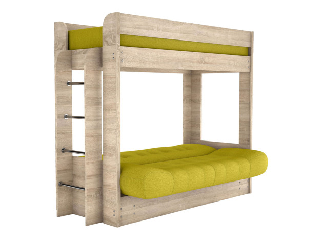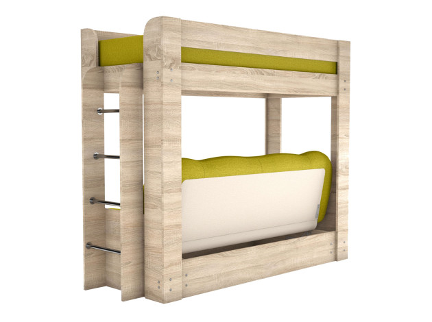 Двухъярусный диван-кровать Твинс — удачное решение для небольшой детской комнаты. На нижнем ярусе можно комфортно отдыхать в дневное время, а за счет того, что диван легко раскладывается, на нем сможет расположиться как ребенок, так и взрослый. Верхний ярус укомплектован матрасом и имеет готовое удобное спальное место для сна. Компактная лестница позволяет без труда подняться на второй ярус, а специальный бортик делает спальное место наверху максимально безопасным.