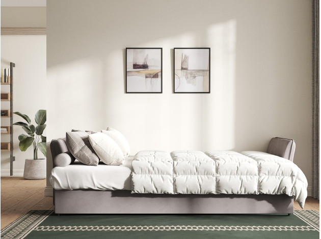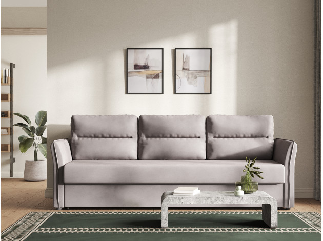 Простой и надежный механизм трансформации превращает диван в кровать, а компактный ящик для белья обеспечивает дополнительное место для хранения. Мягкая обивка приятна на ощупь и устойчива к износу. Возможность установить модель спинкой на виду — еще одно преимущество.