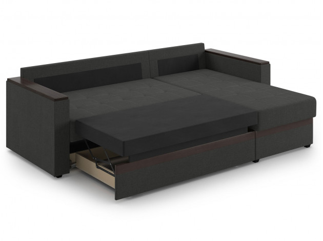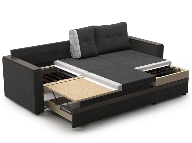 Модель легко раскладывается, образуя ровную поверхность, при этом спинка защищает от соприкосновения со стеной и делает спальное место уютнее. В оттоманке расположен вместительный бельевой ящик.