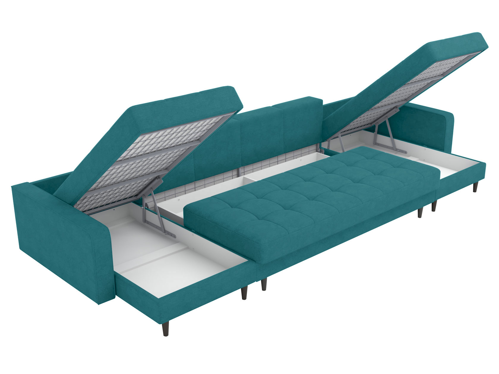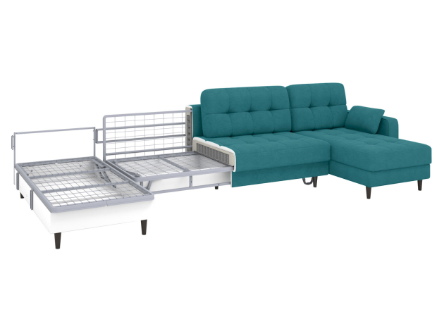 В разложенном виде образуется просторное спальное место. Матрас на основе пружинного блока создает оптимальную поддержку тела и подходит для ежедневного сна. Для постельных принадлежностей и других вещей предусмотрено несколько бельевых коробов. Убирать под диваном легко: под высокими ножками свободно проезжает робот-пылесос.