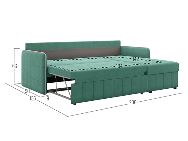 Прочный и устойчивый к нагрузкам механизм. Наиболее часто применяется в угловых диванах. Для трансформации нужно вытянуть из-под широкой части дополнительную секцию с подъемным механизмом и приподнять, чтобы она сравнялась с уровнем сиденья. Подходит для ежедневного использования.
